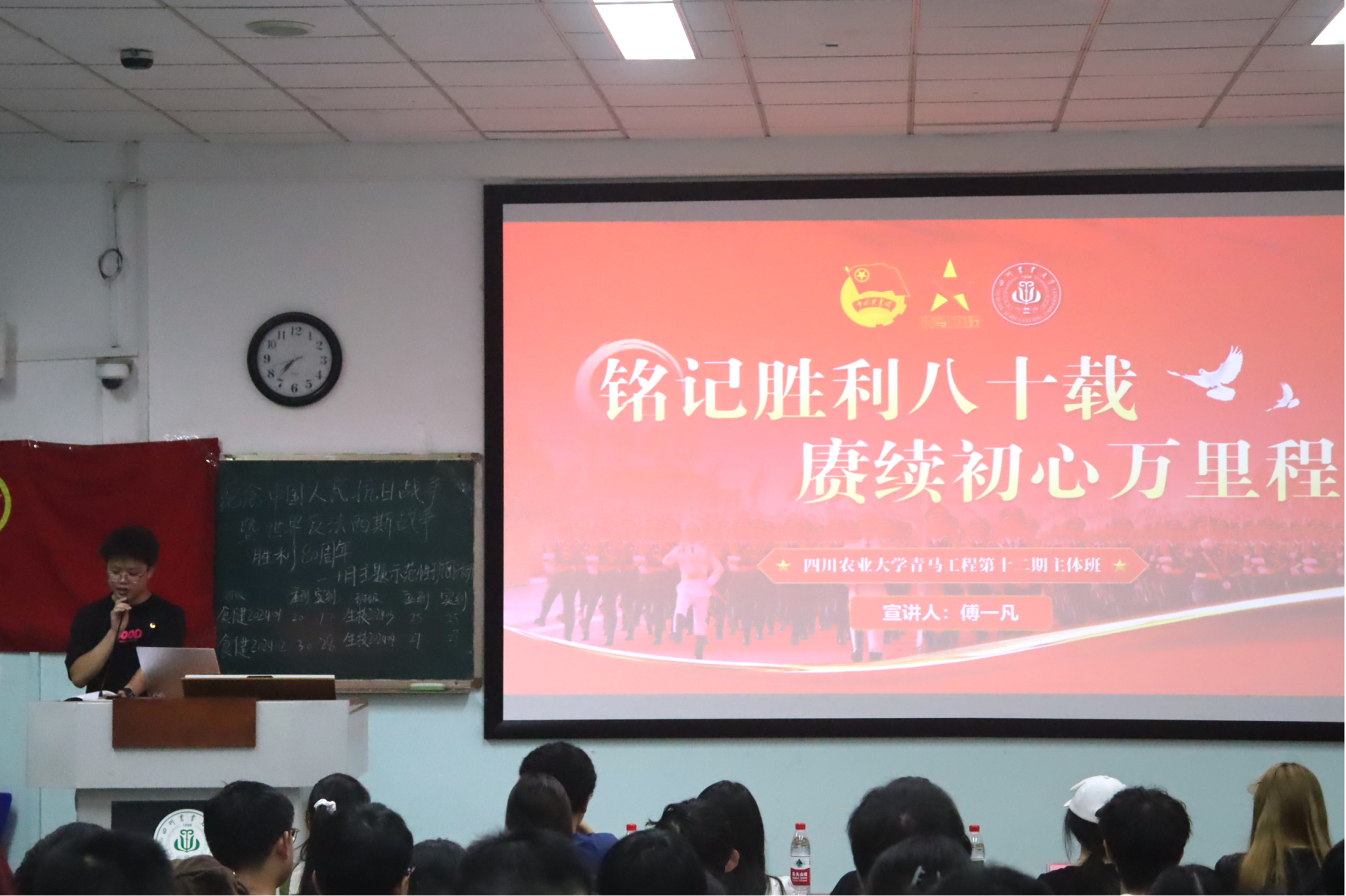 活动伊始,校青马班学员傅一凡以“铭记胜利八十载,赓续初心万里程”为主题,深入解读习近平总书记关于抗战胜利80周年的重要讲话精神,并生动讲述川农人在不同历史时期为国家发展作出的卓越贡献,激励同学们要以抗战精神为引领,将个人理想融入民族复兴的伟大征程。