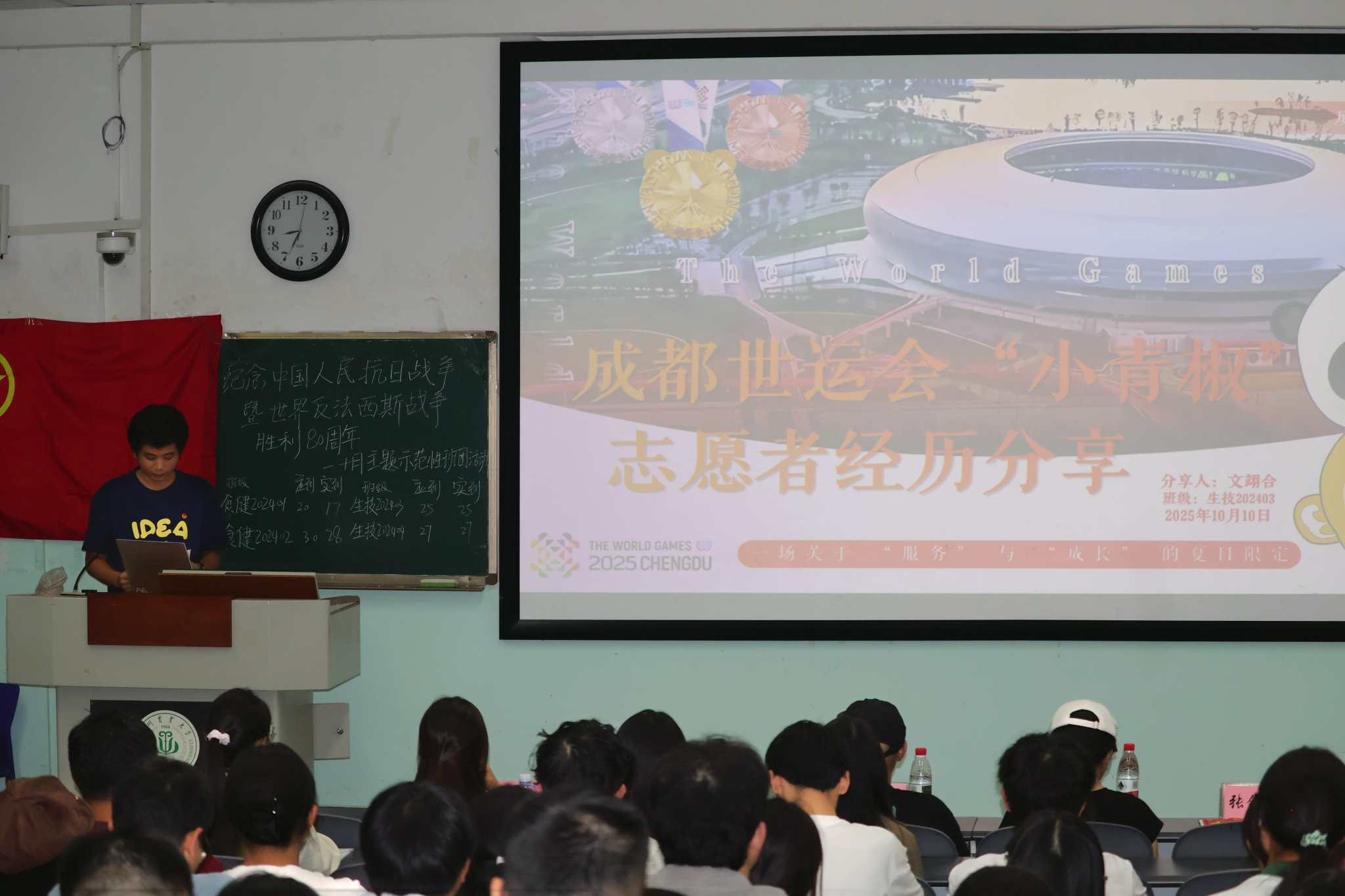 参与成都市运会志愿服务的生科学子文翊合分享了作为“小青椒”在服务期间的感人故事与成长体会。他表示,世运会的火炬虽已熄灭,但志愿服务所点燃的奉献之火、互助之光,将永远照亮我们前行的路。他鼓励同学踊跃参与志愿服务,践行青年责任。