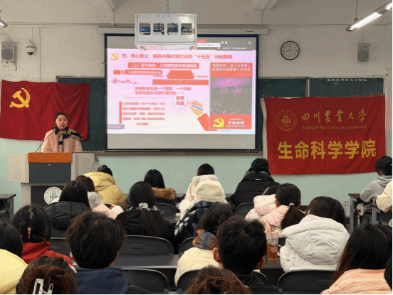 彭雪聚焦“十五五”规划建议的核心框架,以“一个引领、六大原则、七方面目标、十二项重要部署和一个保障”为主线为同学们深入解读《中共中央关于制定国民经济和社会发展第十五个五年规划的建议》。她强调,要始终以习近平新时代中国特色社会主义思想为指导,坚守“五个以、两个推动、一个确保”的实践要求,将稳中求进工作总基调、高质量发展主题贯穿各项工作。聚焦“六大原则”,彭雪重点解读了“坚持有效市场和有为政府相结合”“坚持统筹发展和安全”两大原则,阐释了其背后蕴含的战略谋划与发展逻辑。围绕“七方面目标”和“十二项重要部署”,彭雪详细讲解了梯次推进社会主义现代化的阶段性目标,强调其与2035年基本实现现代化的远景目标紧密衔接。她鼓励同学们结合生命科学领域特色,重点分析现代化产业体系建设、科技自强自立、绿色转型等部署,将个人理想融入国家发展大势。同时,强调了全面从严治党的重要意义,要求党员同志严守党的纪律规矩,树立正确政绩观,同时倡导以系统思维落实政策、以团队协作凝聚合力、以优良作风筑牢保障。