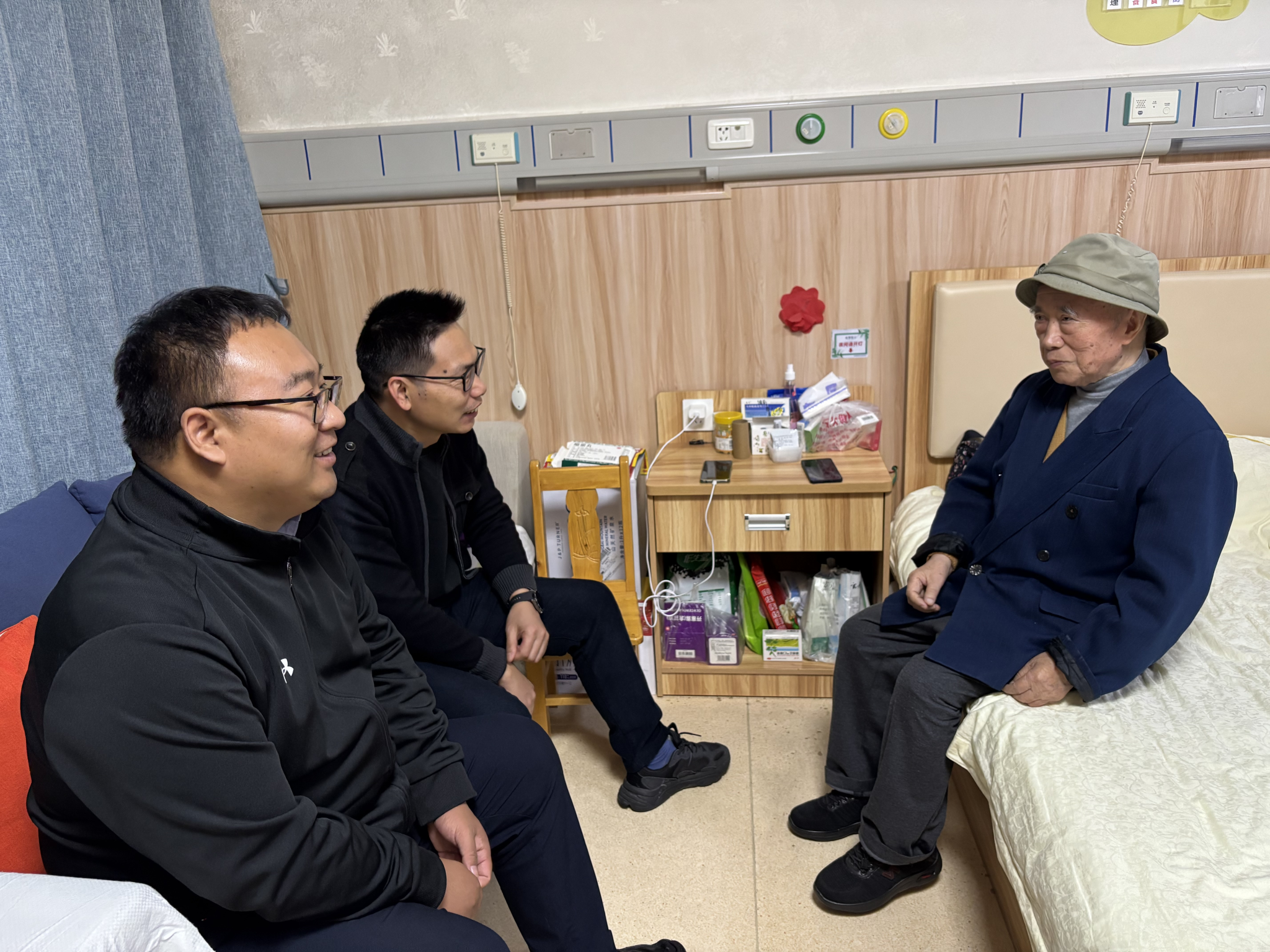 慰问组一行首先来到草坝镇雅安市雨城区人民医院康养中心的张仲良老师处。朱长文副书记与刘贺贺副院长悉心询问张老师的身体状况与生活近况,对他多年来为学院发展所做出的贡献表示衷心感谢,并代表学院送上节日慰问品。张仲良老师虽已高龄,却精神矍铄、思维清晰。他由衷感谢学院的牵挂与看望,并深情回忆起昔日执教科研的岁月,言语间满溢对学院的深厚情谊。