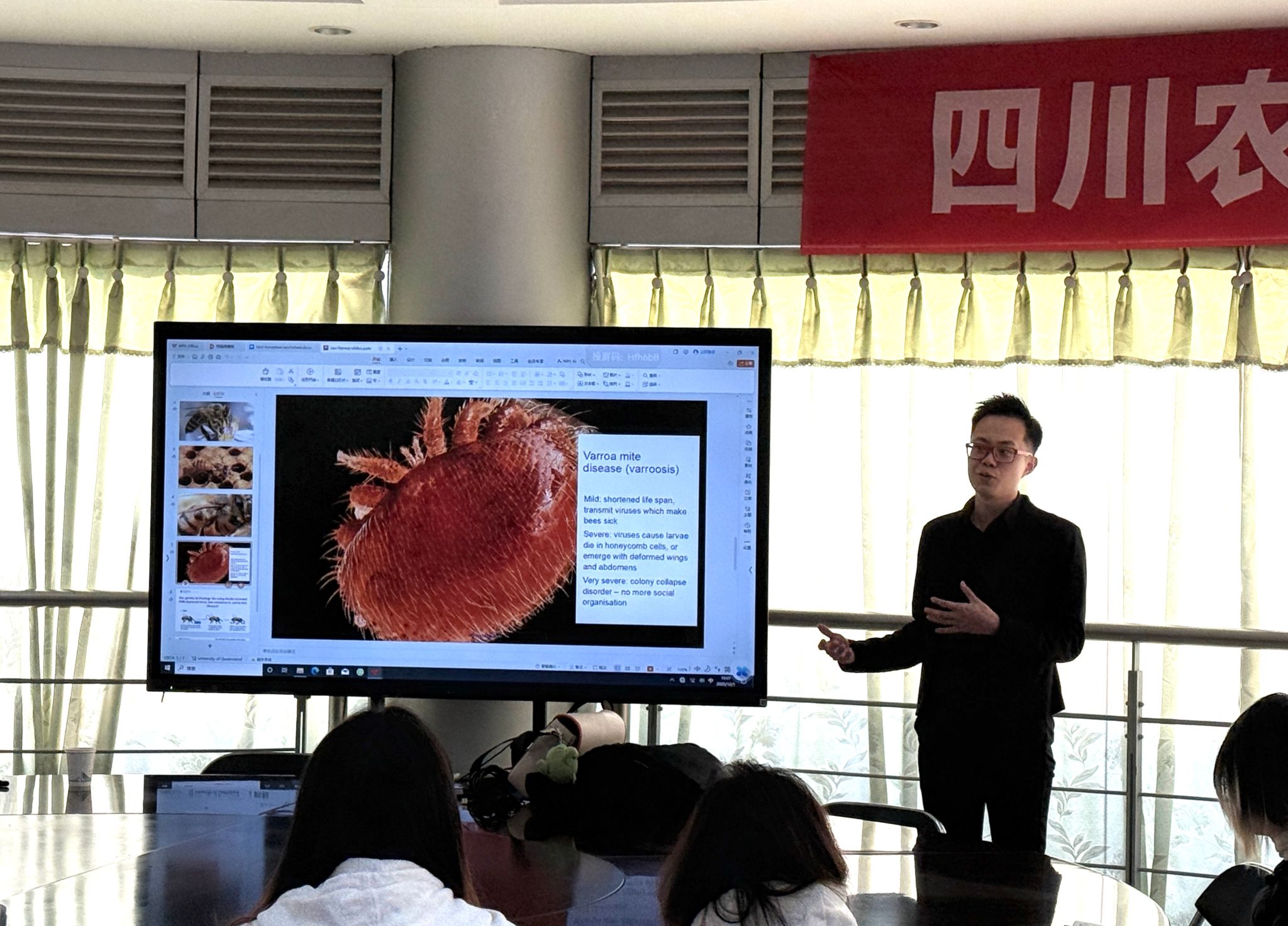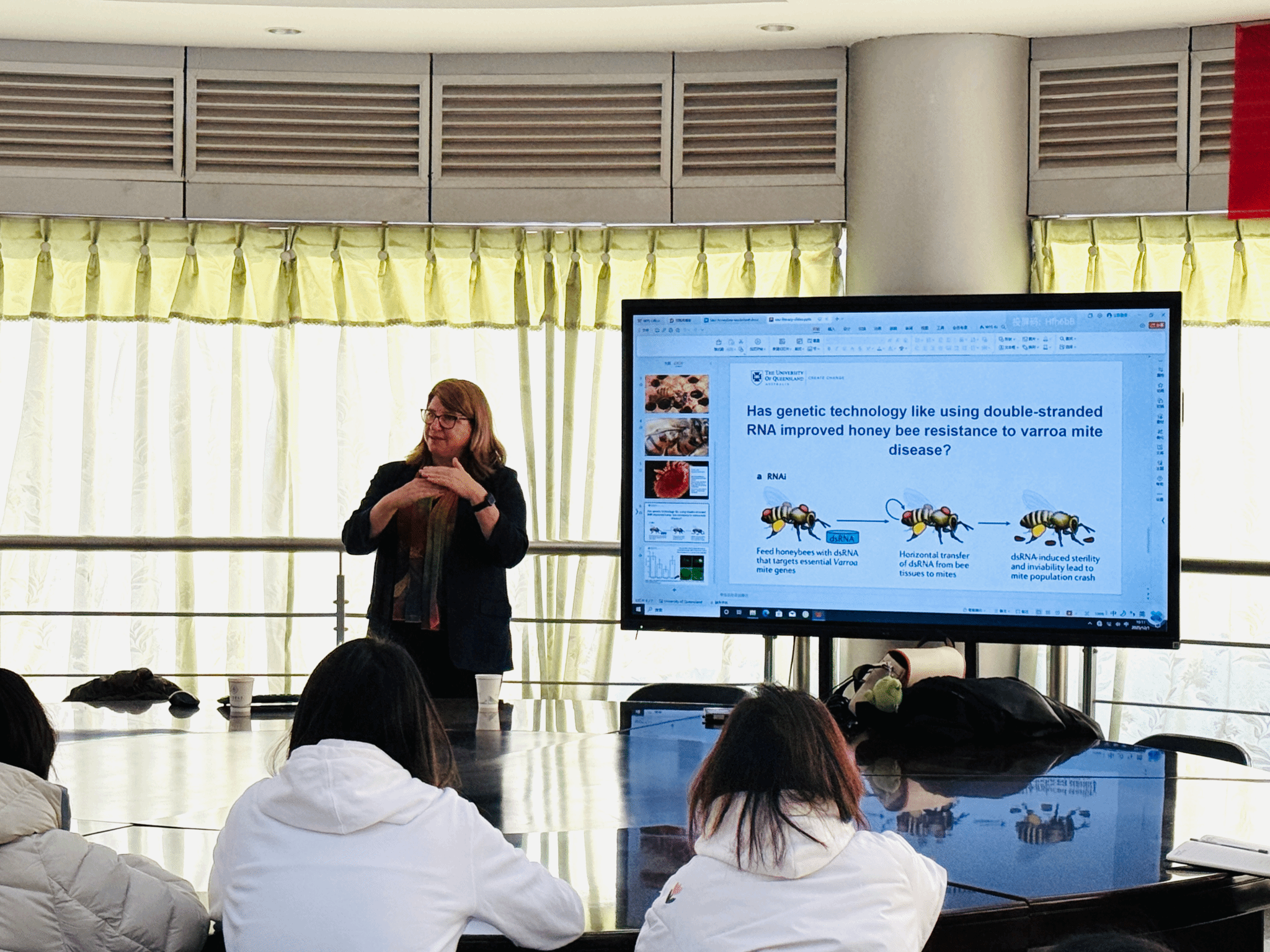 在题为“Academic Literacy”的讲座中,两位学者以澳大利亚蜜蜂面临的瓦螨(Varroa mite)入侵为切入点,引导学生深入探讨了一项前沿基因控制技术——双链RNA(dsRNA)疗法。“这不仅是生态议题,更是经典的宿主-寄生虫互作模型,”Gurion Ang博士指出,“传统化学防治面临耐药性与环境污染挑战,而dsRNA技术通过特异性沉默瓦螨关键基因,可精准干扰其繁殖过程,展现出基因调控在农业害虫防治中的潜力。”