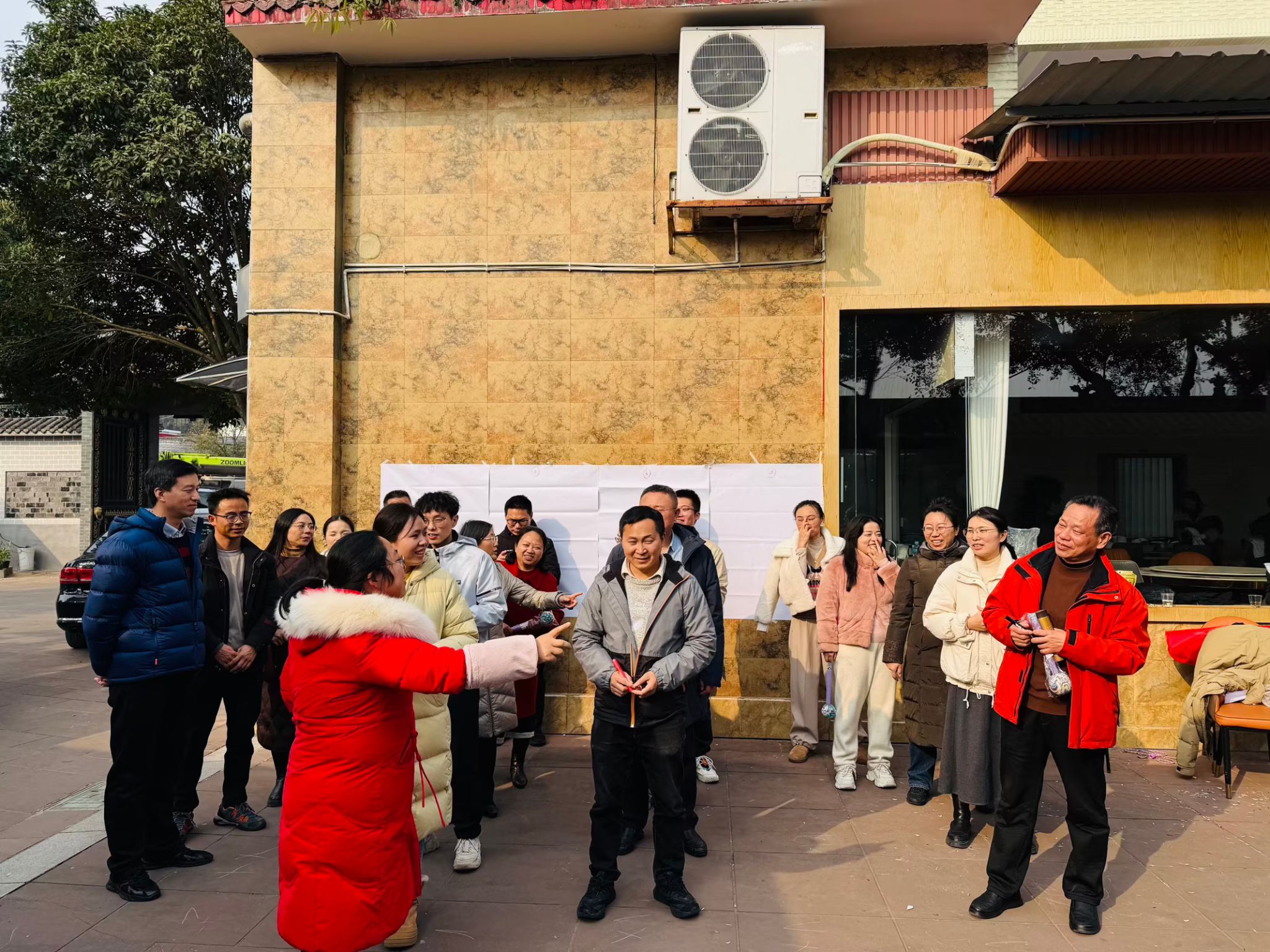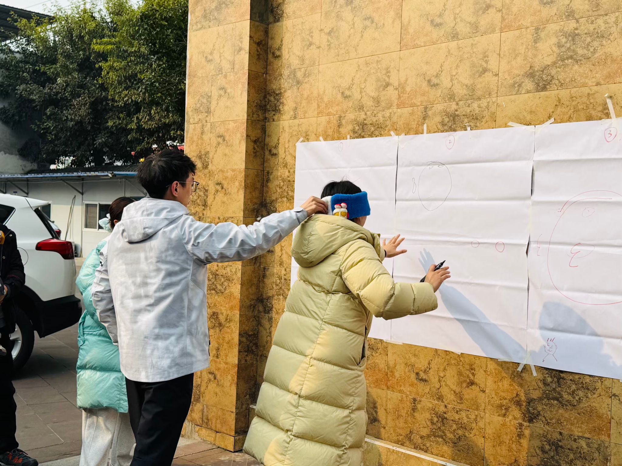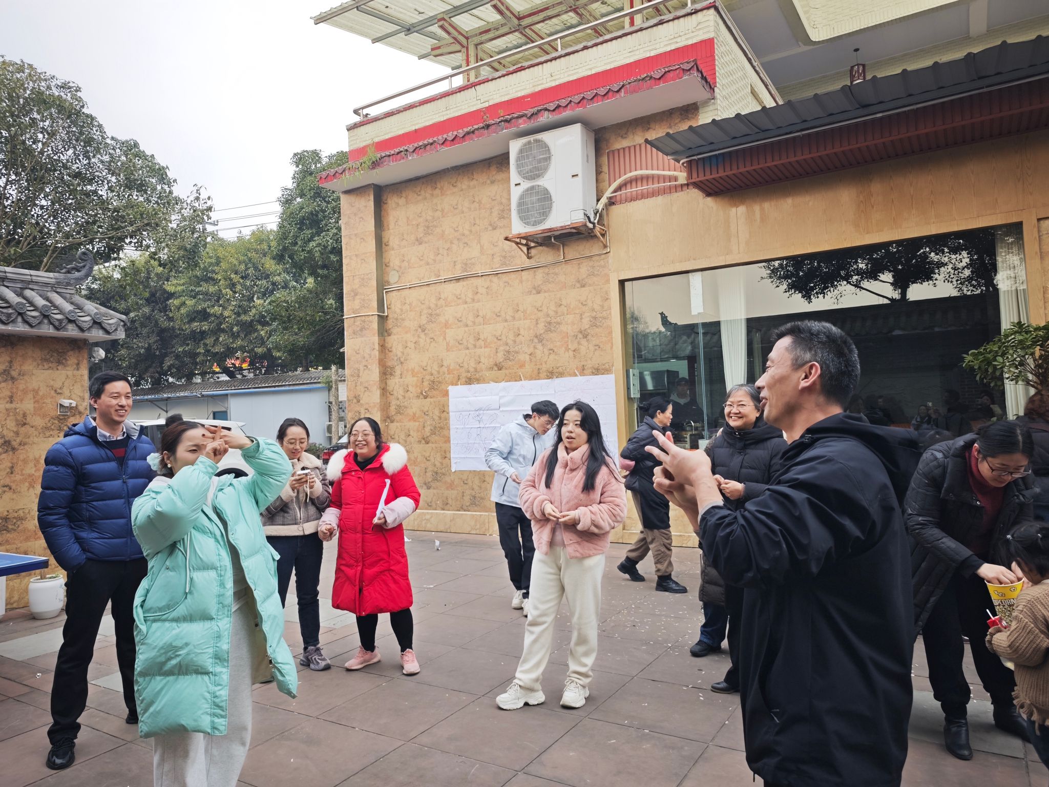 午餐时间,邛崃特色杀猪菜与新鲜年猪肉的多形式烹制成为焦点。老师们围坐一堂,大口品尝地道美食,感受地方风味,欢声笑语间尽显团队温情。餐后,活动设置了“你比我猜”和“盲人画画”游戏,旨在通过趣味互动进一步拉近大家的距离,营造轻松愉快的氛围。