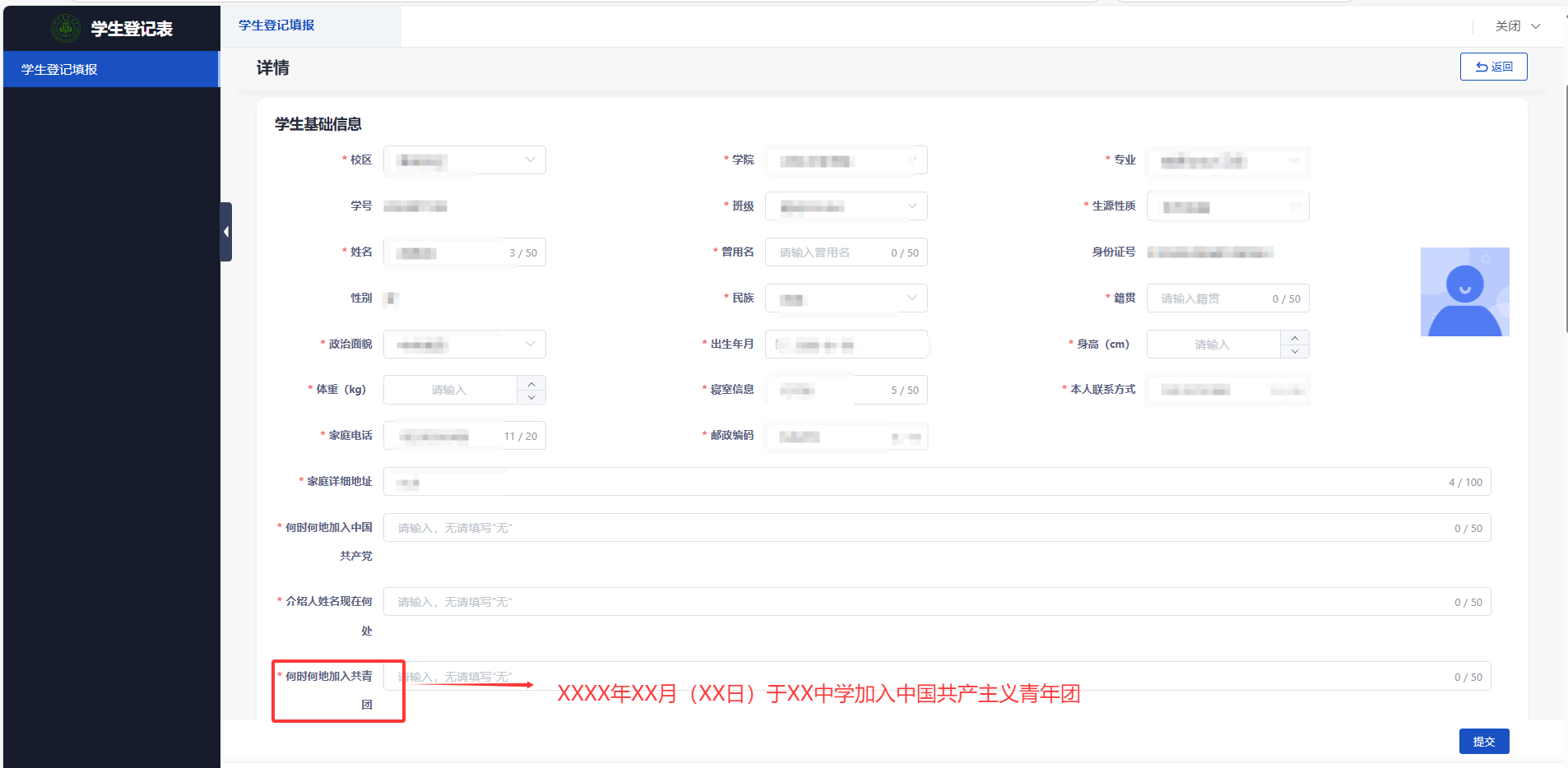 (二)请各班主任提醒各位同学认真填写,仔细核实相关信息,避免因漏填错填对学生毕业后政治审查等关系个人发展的事宜产生影响。