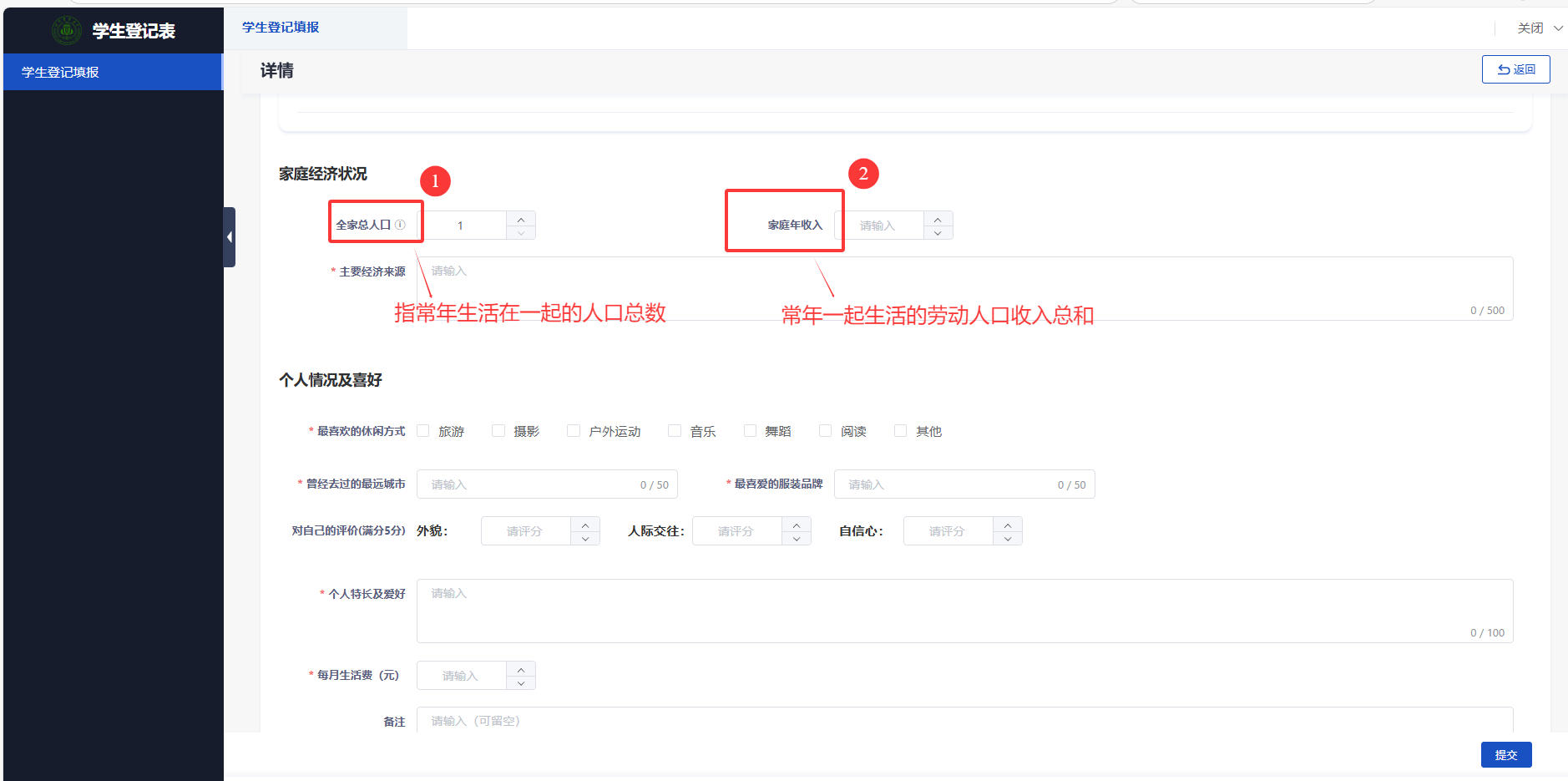(1)填写后务必点击“提交”(带*号为必填项,填写不完整将无法保存);