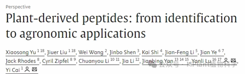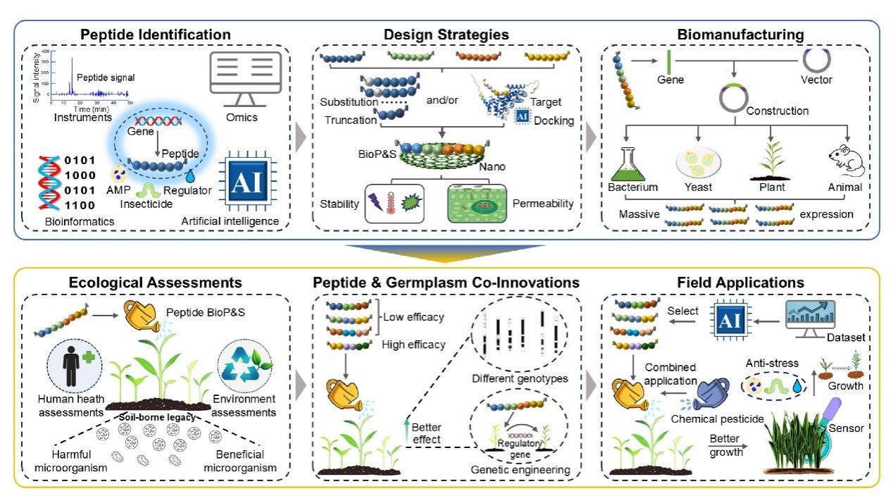 近日,四川农业大学玉米研究所卢艳丽教授与生命科学学院蔡易教授团队联合中国科学院、浙江大学、中山大学、英国东英吉利大学、瑞士苏黎世大学等国内外10余家高校及科研机构,在植物学权威期刊《Molecular Plant》(IF=24.1)发表题为《Plant-derived peptides: from identification to agronomic applications》的前瞻性(Perspective)综述论文。Perspective栏目一直聚焦植物核心议题,具有非常高的学术稀缺性与领域引领力。本文创新性提出“植物小肽鉴定-分子设计-生物制造-生态评估-药种协同创新-田间应用”全链条创新体系,通过整合人工智能、纳米技术和合成生物学等前沿技术,为破解小肽规模化生产成本高、田间稳定性差等产业化瓶颈提供了兼具科学性与可行性的系统解决方案。