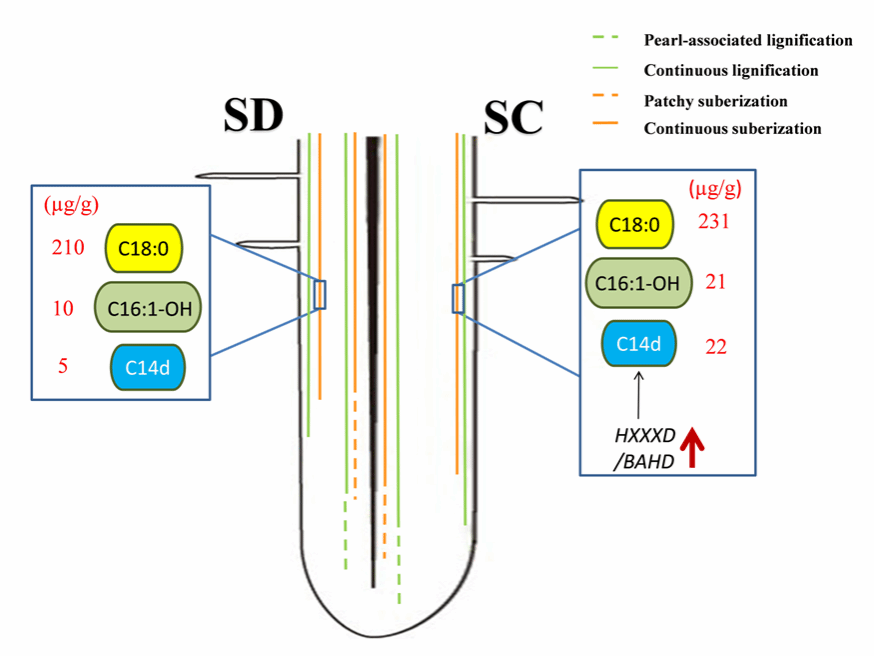 研究发现,低镉积累表型与根尖质外体屏障的提前形成及木栓质沉积显著增强密切相关。进一步结合代谢组与转录组分析,团队发现镉胁迫可诱导关键木栓质单体的选择性合成,包括对羟基肉桂酸、C18:0、C16:1-OH以及首次在低镉积累型SC中检测到的特异性诱导单体C14d,这一过程可能由HXXXD/BAHD酰基转移酶家族成员介导。上述木栓质组成的定向变化有效增强了根皮层质外体屏障的不透性,从而显著减少了Cd²⁺的内流。