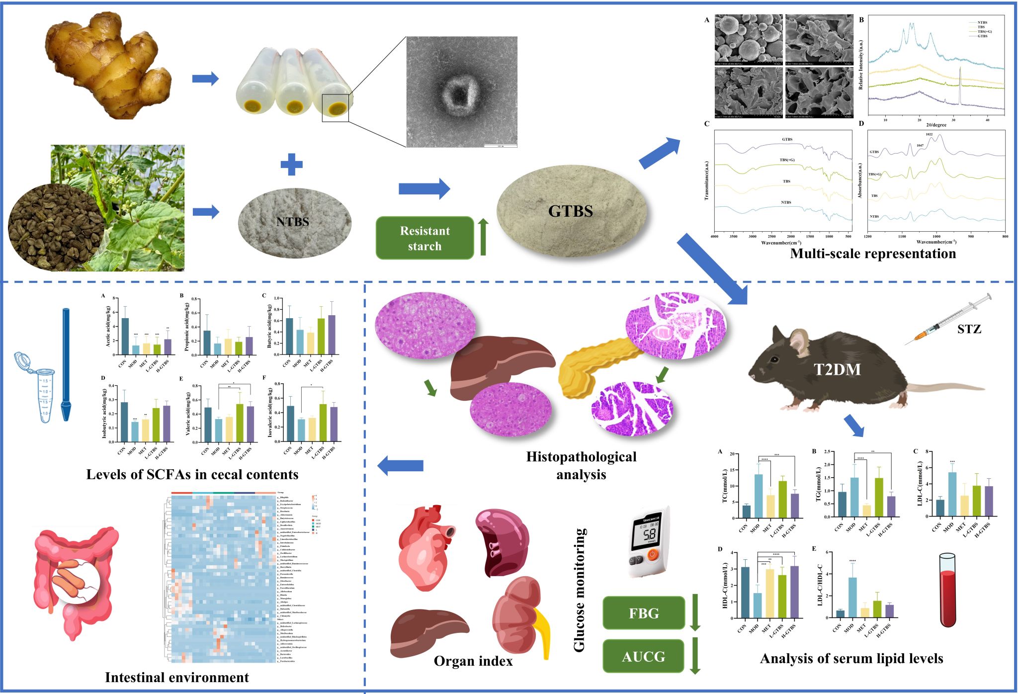 多尺度理化表征结果显示,生姜外泌体通过氢键等分子间作用力与淀粉结合,可显著提升淀粉结晶度与短程有序结构,有效增强淀粉的抗消化特性。动物模型实验结果表明,GTBS能够有效降低Ⅱ型糖尿病小鼠空腹血糖与血脂水平,减轻相关器官病理损伤;同时优化肠道菌群结构、提高短链脂肪酸含量,实现对机体代谢的系统性调控。