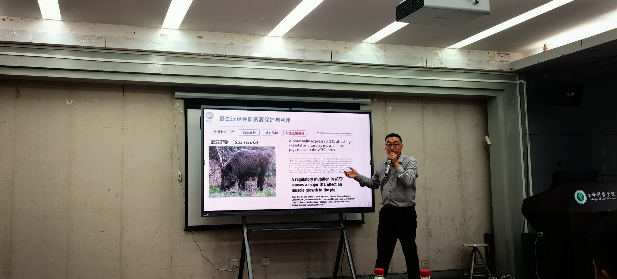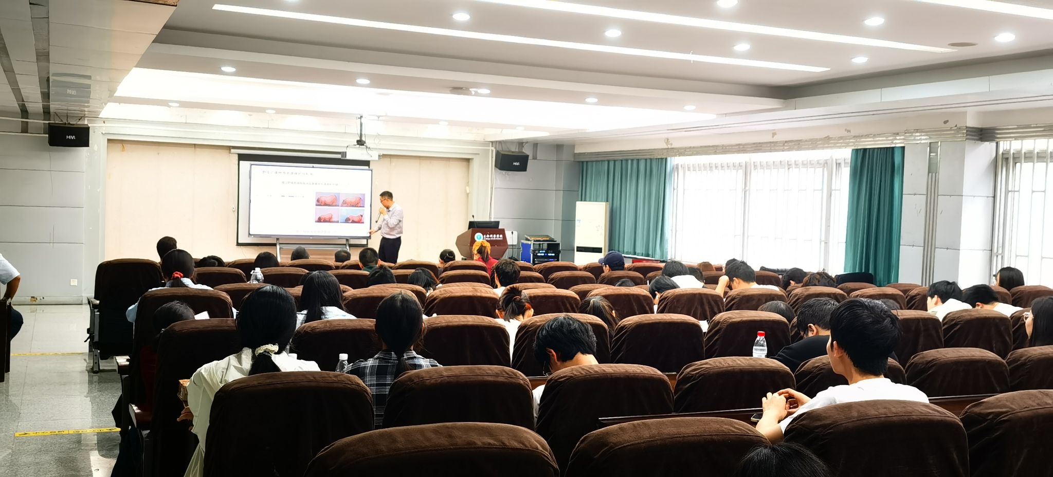 余大为研究员围绕《体细胞核移植技术在濒危家畜遗传资源保护中的应用》展开报告。他以“复活恐龙”这一引人入胜的设想为切入点,引导学生共同探讨相关科学可能性,进而深入介绍了基因编辑与克隆技术应用、畜禽种质资源保护以及国家畜禽种质资源库建设进展。余大为团队不仅利用体细胞克隆技术成功培育出全球首例克隆犏牛,攻克高海拔环境下的克隆难题,还通过基因芯片筛选与全基因组选育技术有效提升了地方牛种质资源价值。此外,团队在干细胞移植、异种嵌合体构建等前沿技术方面的探索,推动肝人源化猪制备等生物医学研究。相关科研成果为动物种质资源保护与利用提供了强大支撑。