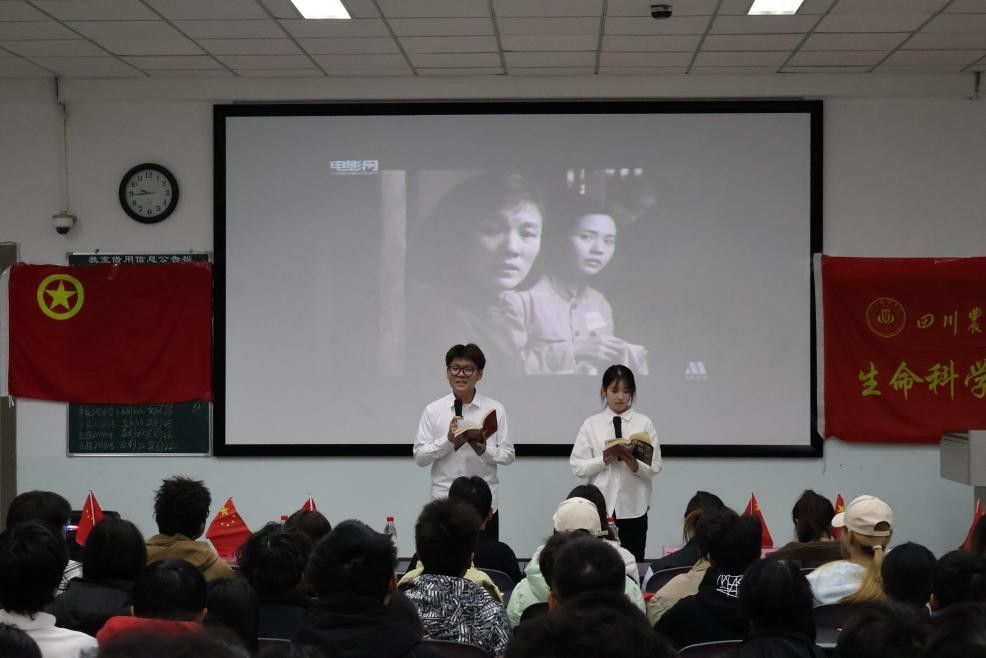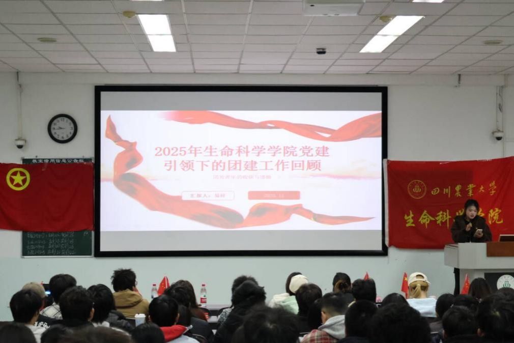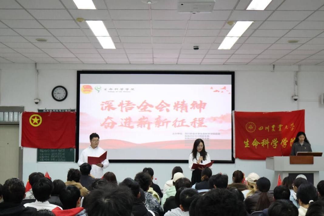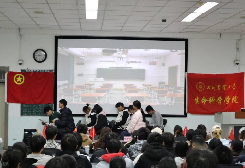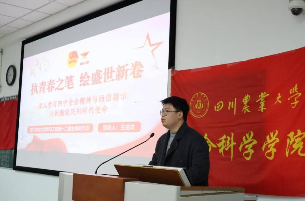理论铸魂:深学细悟凝聚青春共识。活动在激昂的团歌声中拉开序幕。校青马班学员、第十二届研支团成员王伯文以“学习全会精神,共绘‘十五五’蓝图”为题,解读了全会核心要义和“十五五”规划部署,并结合新闻播报视频,生动呈现国家发展蓝图。他特别分享了川农大校友关祖苹扎根基层、通过直播助农推动乡村振兴的鲜活案例,生动诠释“强农兴农”初心,激励团员将川农大精神与“十五五”发展蓝图相结合,让青春在服务国家战略中绽放光彩。