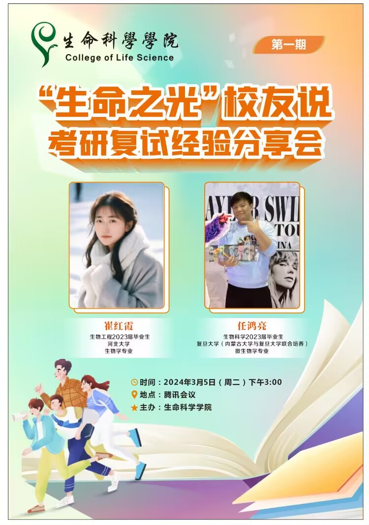 为进一步推进2024届毕业生考研工作,加强考研学生复试及调剂指导,帮助学生答疑解惑、调整心态、成功上岸,3月5日下午,学院2023届毕业生任鸿亮、崔红霞受邀参加“生命之光”校友说(第一期),结合自身复试及调剂经历为2024届师弟师妹进行在线指导。