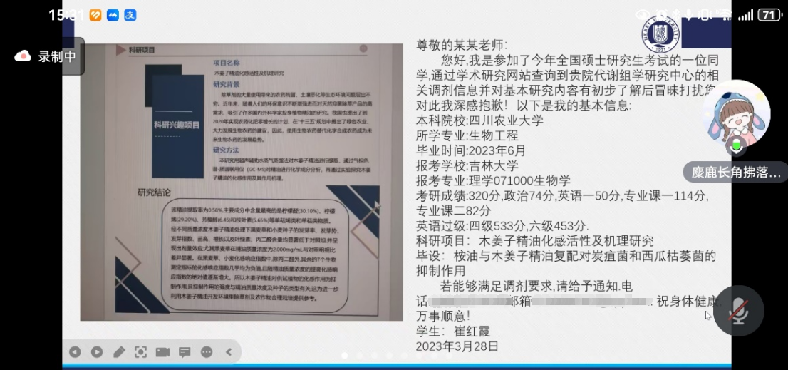 任鸿亮,生物科学专业2023届毕业生,去年调剂到内蒙古大学,现就读于复旦大学(内蒙古大学与复旦大学联合培养)。他结合自己的调剂经历,详细解读了调剂过程中有关信息来源、院校选择、时间节点等调剂关键步骤,建议师弟师妹在选择调剂院校时,不仅要考虑学校的学科实力和教学质量,还要关注学校的录取分数线和招生政策。崔红霞,生物工程专业2023届毕业生,现就读于河北大学,分享了她在不同院校间复试的经历和录取标准的观察。她通过自己的实例提醒同学们,要全面了解各院校的复试内容和录取标准,为自己的考研之路做好充分准备。同时,她鼓励大家要正视自己的优势和不足,要根据自身的情况和意愿,合理选择调剂的学校和专业,不要盲目跟风或放弃,要制定合理的目标,全力以赴去争取最好的结果。