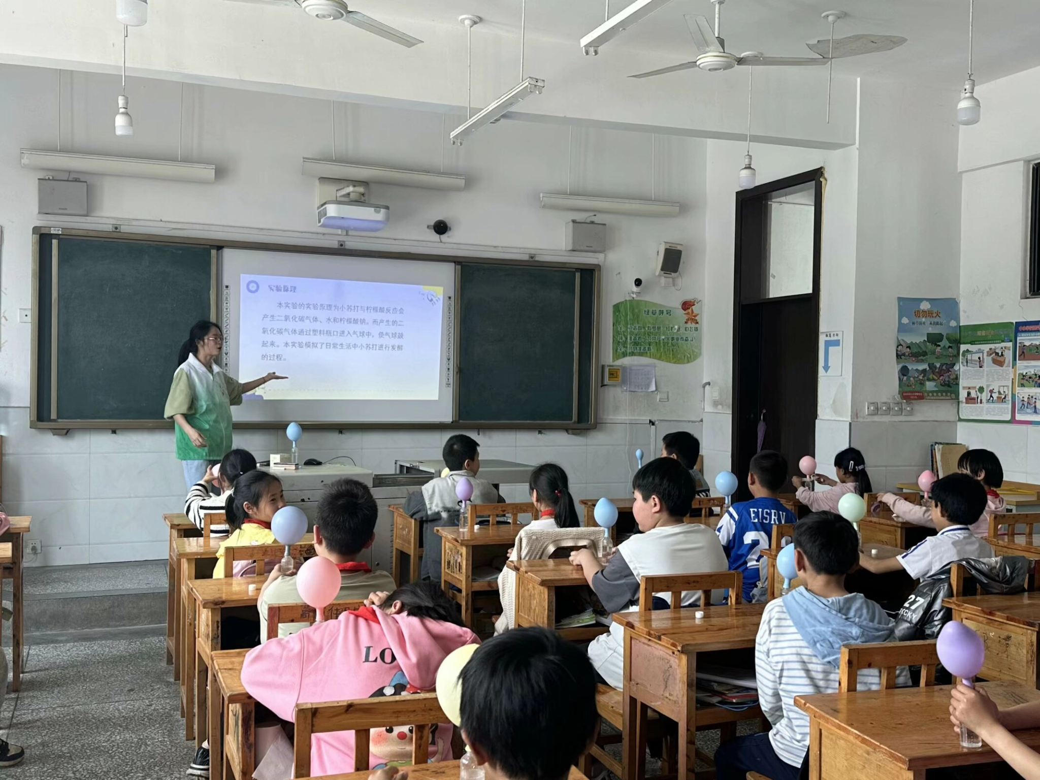 在课程实践环节中,为加深小朋友们对发酵原理的理解,志愿者苏艳齐利用柠檬酸与小苏打反应会释放出二氧化碳气体的原理,设计了“瓶子吹气球”的实验,展示了发酵食品在发酵过程中会产生二氧化碳的现象。实验中,当柠檬酸溶液被倒入装有小苏打的塑料瓶中后,瞬间产生了大量二氧化碳气体使气球膨胀。小朋友们不禁惊叹连连:“这也太神奇了!”“原来面包和蛋糕就是因为这种气体才变得松软多孔的啊!”