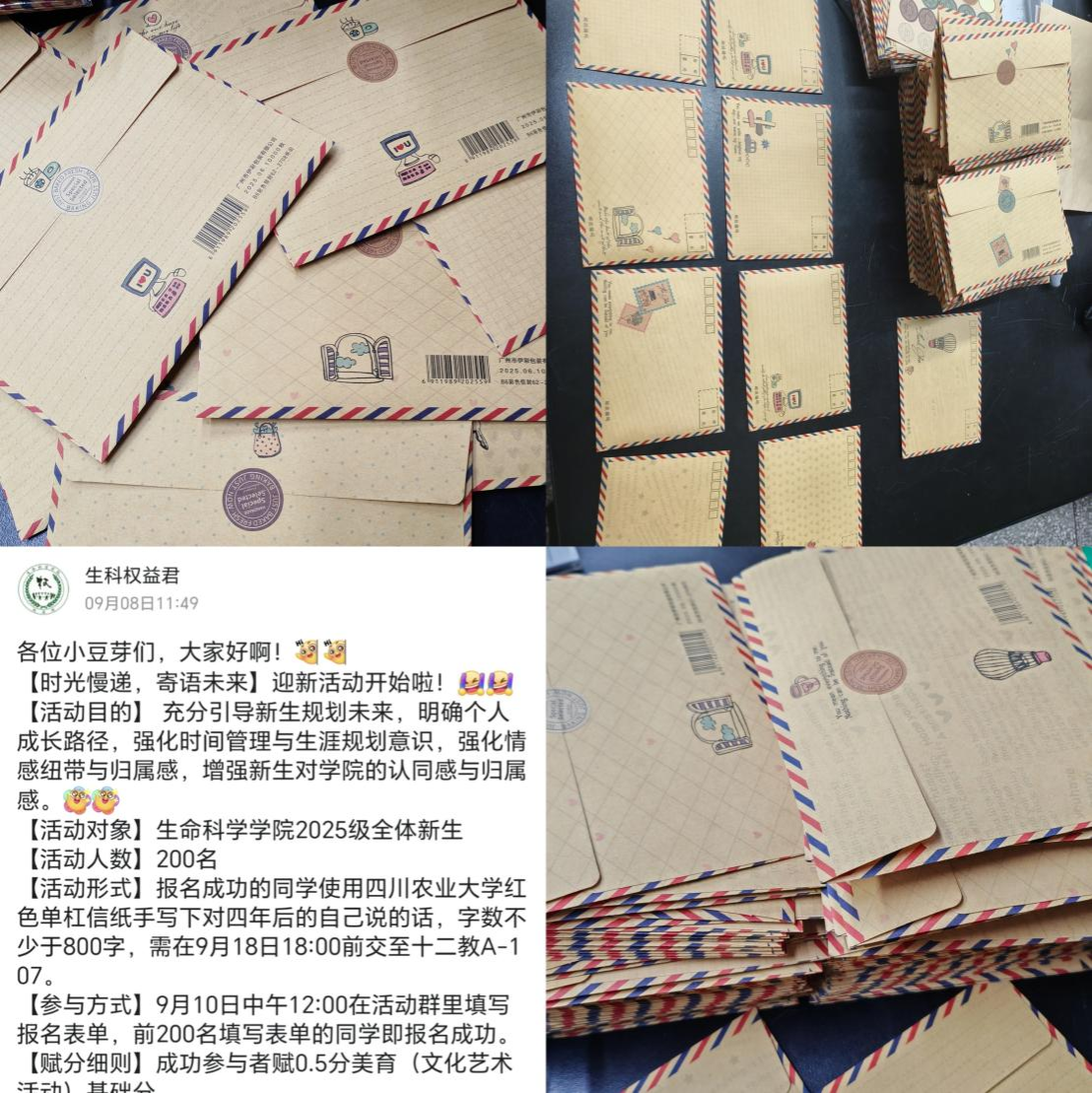 一笔一划写下青春的愿景,一字一句寄托未来的期盼。9月11日至21日,生命科学学院学生会权益部与学生会办公室联合推出“时光慢递,寄语未来”迎新活动,引导2025级新生以书信形式对话四年后的自己。活动共收到121封手写书信,纸短情长,承载着新生们对大学生活的憧憬与对成长之路的坚定信念。