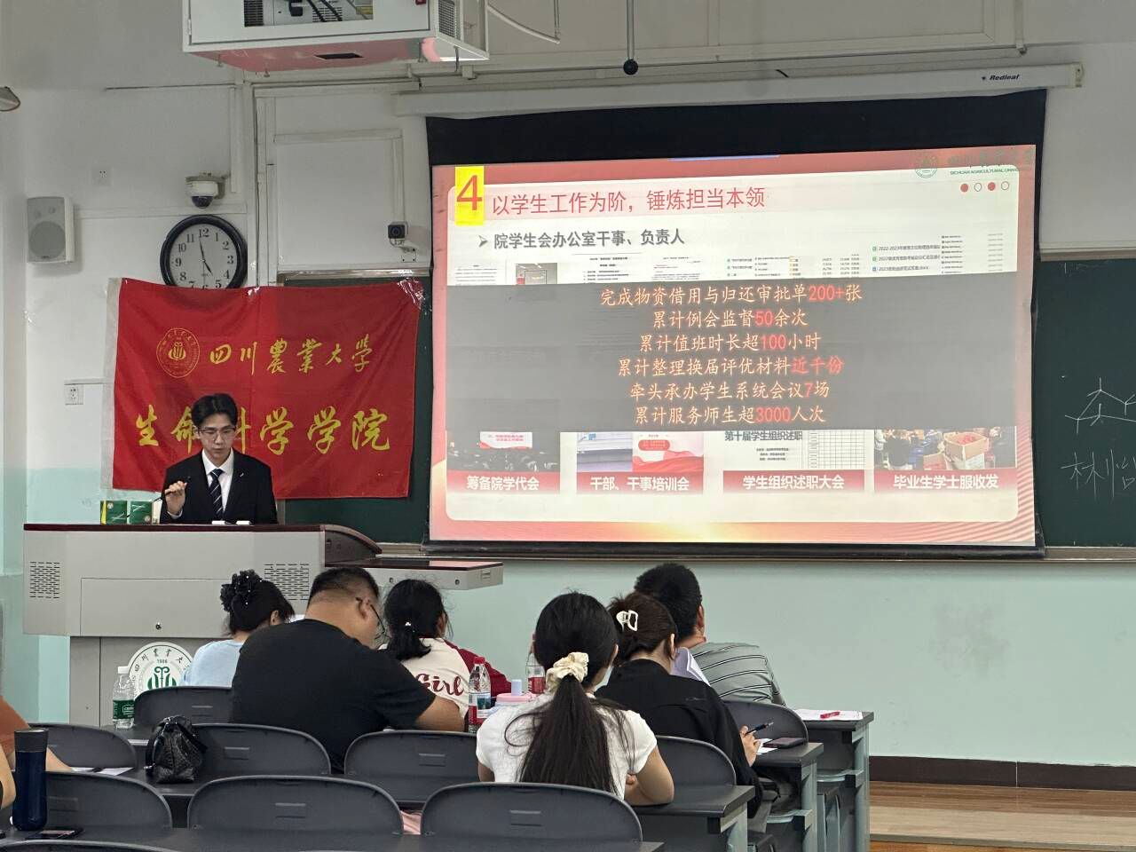答辩会现场,10位候选人依次登台,围绕思想品德、学业成绩、科技创新、社会实践与志愿服务等方面,全面而生动地汇报了各自在校期间的成长足迹与丰硕成果。他们中有的深耕学科交叉,在生物信息学与计算生物学领域初露锋芒,以多项高水平科研成果获得顶尖科研机构直博资格;有的秉持“垒石筑基”的信念,在信仰、学问、实践中锤炼自我,并以卓越的组织领导能力服务集体;有的以“向山而行”的毅力,不断踏难而上,在学业科研与社会服务的双重攀登中展现担当;有的将一张“精神粮票”传递不息,在自我突破与薪火相传中诠释责任;有的在“风暴中心”潜心耕耘,以惊人的毅力与执着最终绽放出绚烂的科研之花;还有的则以“小身体”汇聚“大能量”,在勤学、担当与奉献中释放光热。候选人们的精彩表现,充分展现了生科学子笃行致远、勇于创新的精神风貌与扎实卓越的综合素质,赢得了现场师生的阵阵掌声。